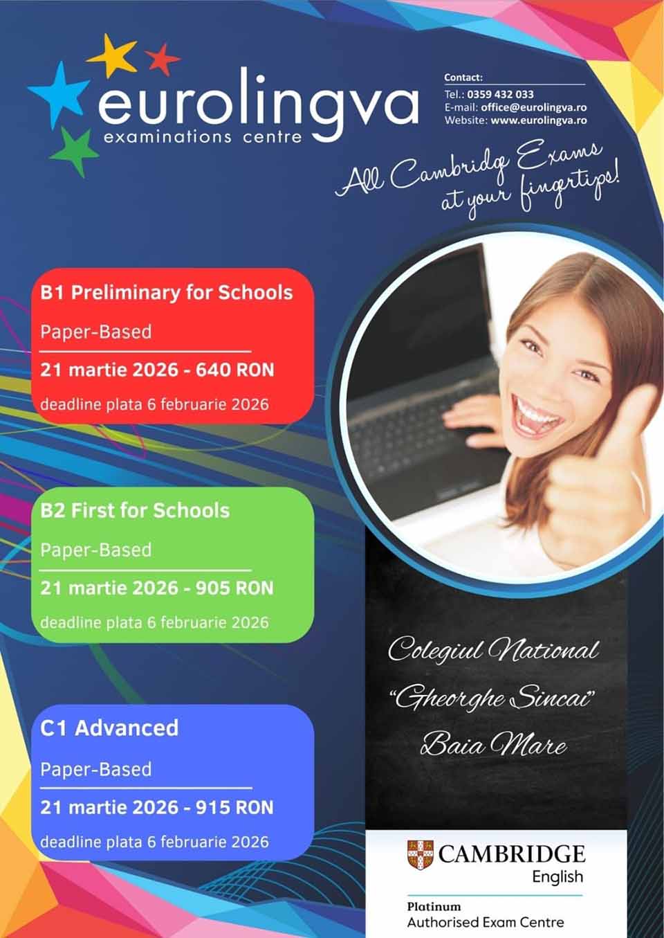 - Examene disponibile: B1 Preliminary for Schools, B2 First for Schools, C1 Advanced