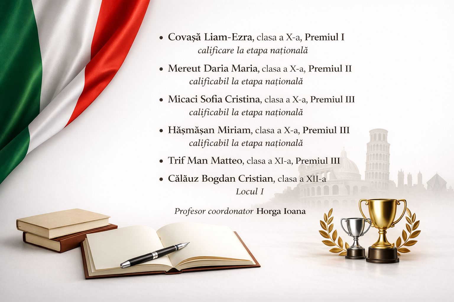 O felicităm pe colega noastră, dna prof. Horga Ioana care i.a coordonat şi motivat în învățarea limbii italiene.